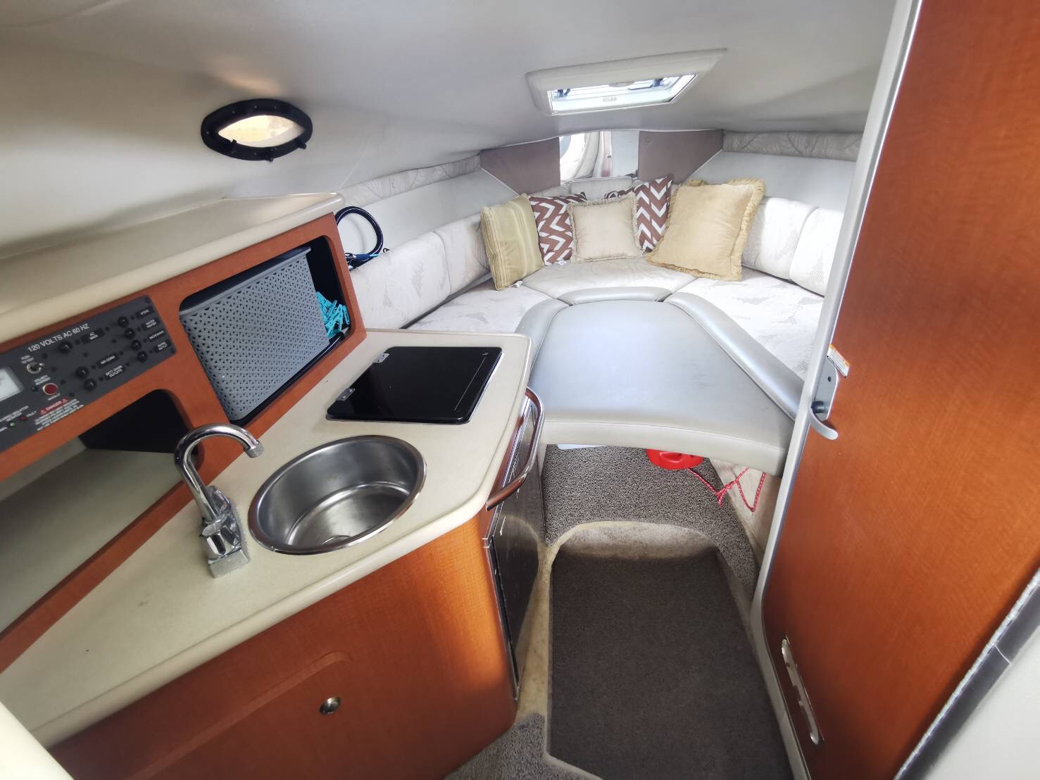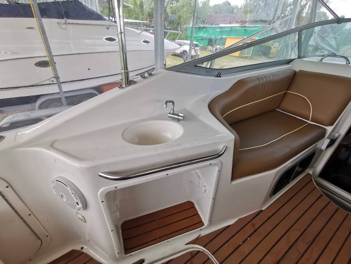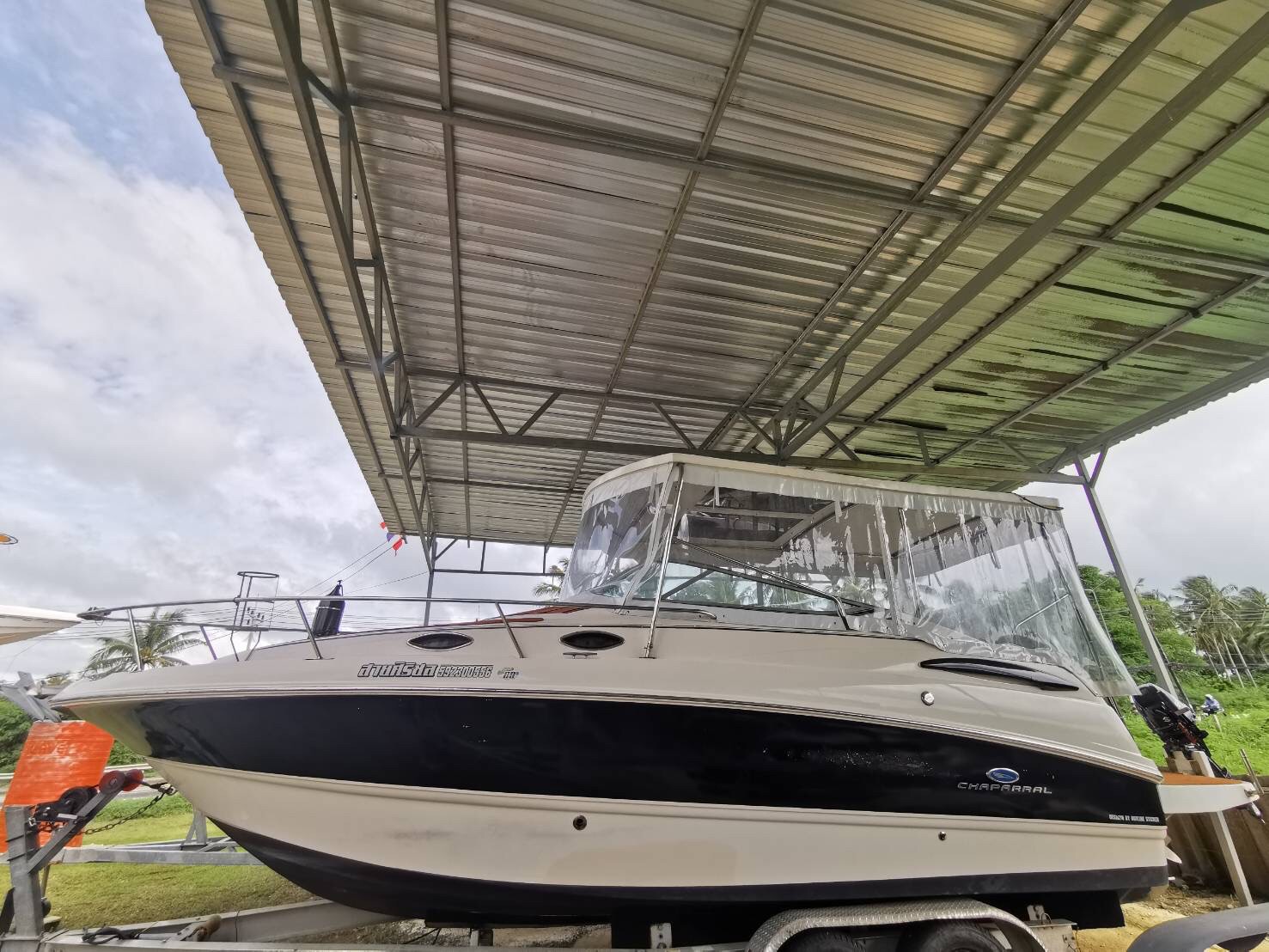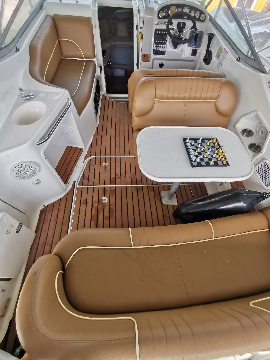 selling a cruising boat Chaparral 240 signature 2006 on a trailer with a Lowrance HDS 12 professional echo sounder and a gas BBQ. There is a solar panel on the roof. The boat has everything you need to go out to sea for a few days and nights: restroom, kitchen, 3 sleeping areas for 5-6 people.