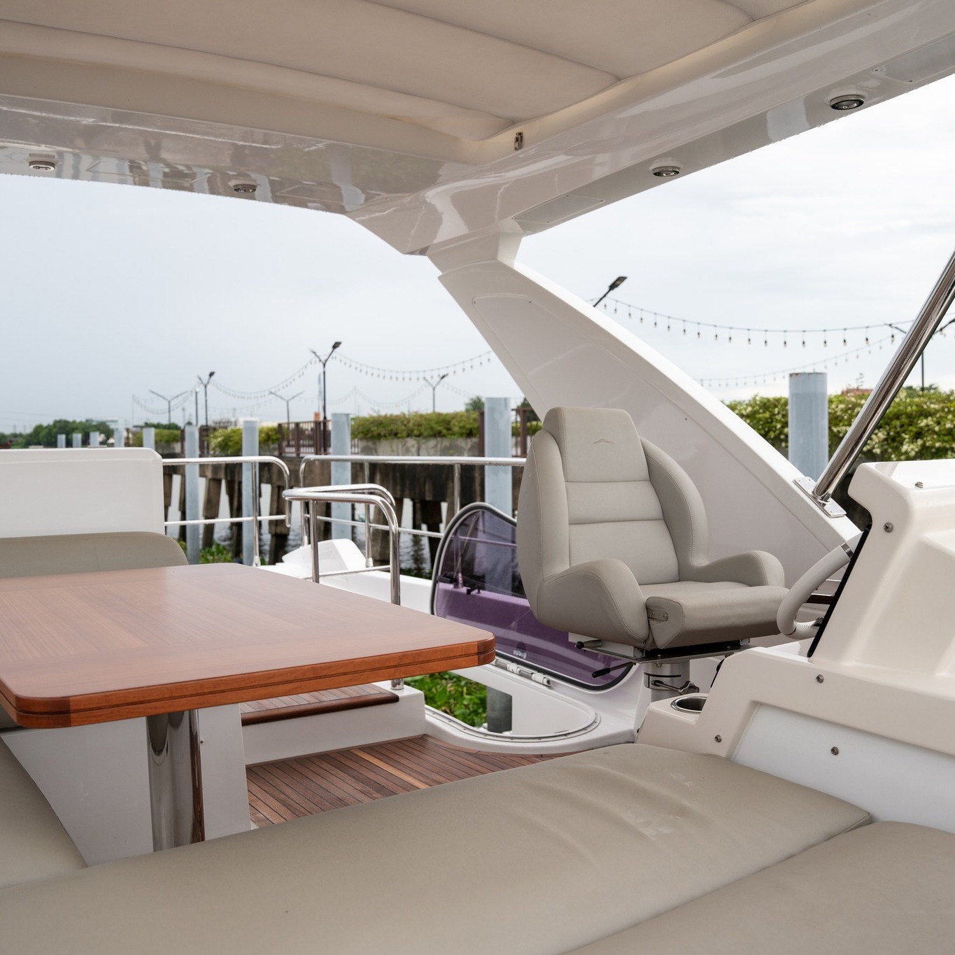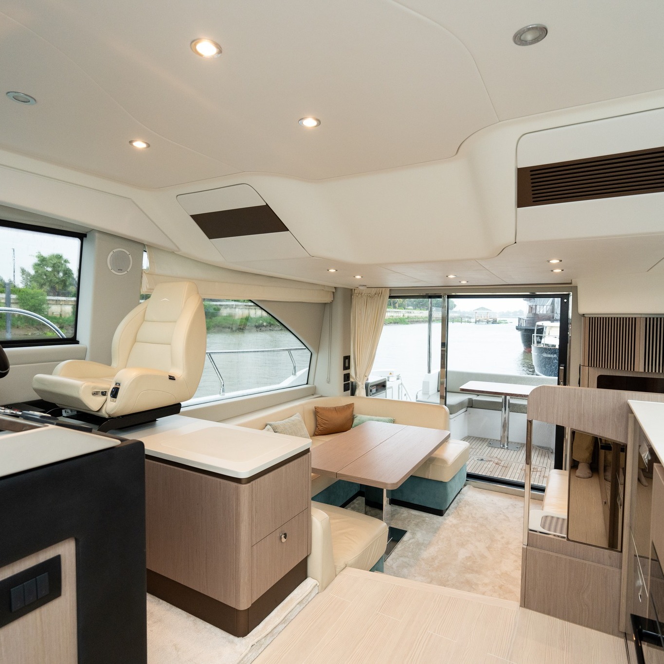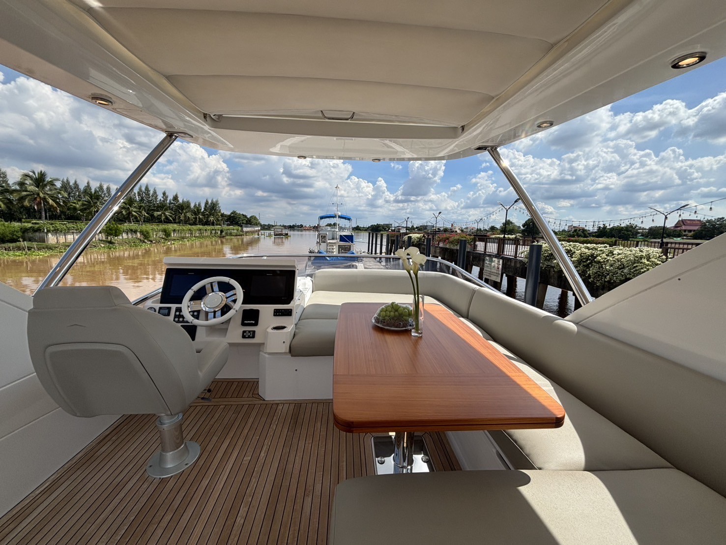Spacious flybridge with helm, dinette, sun loungers, and bar cabinet