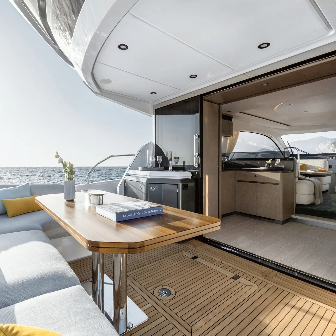 • Aft cockpit with bar cabinet, sink, ice maker, and bottle chillers